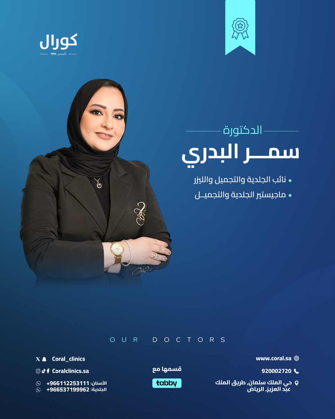الدكتورة سمر البدري نائب الجلدية والتجميل والليزر – خبرة تتجاوز 10 سنوات وماجستير الجلدية والتجميل .الدكتورة سمر البدري، تتميز بخبرة واسعة في تشخيص وعلاج مختلف مشاكل البشرة والشعر، إضافة إلى مهارتها العالية في الإجراءات التجميلية غير الجراحية مثل حقن البوتوكس والفيلر وجلسات البلازما والميزوثيرابي. تهتم الدكتورة سمر بتقديم حلول علاجية وتجميلية آمنة تعتمد على أحدث التقنيات الطبية لتحقيق نتائج طبيعية تُعزز ثقة المريض بنفسه. كما تُعرف بدقتها وحرصها على المتابعة المستمرة مع المراجعين لضمان أفضل النتائج والحفاظ على صحة البشرة ونضارتها في جميع المراحل